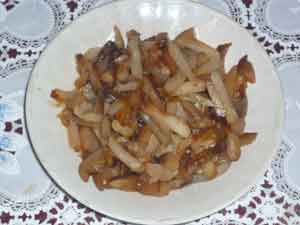Шампиньоны берем свежие или свежезамороженные. Замороженные не до конца размораживаем, так они будут легче нарезаться. Нарезаем их соломкой.