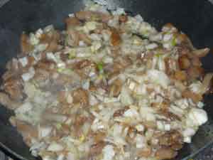 Лук и грибы обжариваем на сковороде 5 минут. Надо посолить и поперчить.