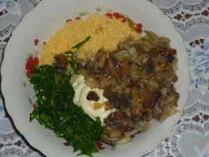 Соединяем грибы с луком, сыр, чеснок, зелень, майонез.