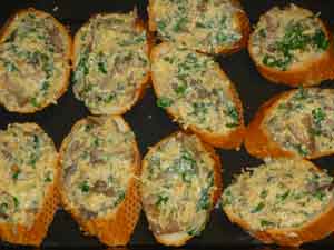 На ломтики багета раскладываем грибную смесь и укладываем бутерброды на противне (противень не нужно смазывать маслом).