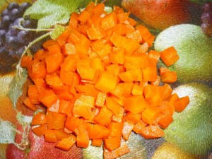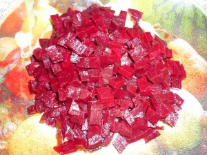 Готовим овощи (картофель, морковь, свеклу) отварить, очистить и нарезать одинаковыми мелкими кубиками.