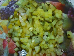 Выложить горкой в салатницу, украсить входящими в состав салата продуктами, можно фигурно нарезать овощи. Я украсила нарезанным огурчиком и маринованным перцем ( оттуда взяла, откуда и огурцы- с банки). Получилось нарядно и божественно вкусно!!! Теперь вы знаете как приготовить винегрет с мясом.