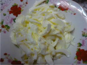 Яйца варим, очищаем, отделяем белки от желтков. Белки нарезаем соломкой.