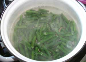После того, как подтаяла наша фасоль, отвариваем ее в слегка подсоленной воде, примерно две минуты после закипания. Долго варить не следует.
