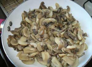 На сковородку, где жарили нашу фасоль, бросаем шампиньоны, но не забываем избавится от жидкости, которая была вместе с грибами. Жарим наши грибочки около десяти минут, постоянно помешивая.