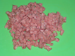 Колбасу вареную и копченую нарезать кубиком. Лучше всего добавлять не один вид колбасы, тогда вкус блюда будет более выраженным.