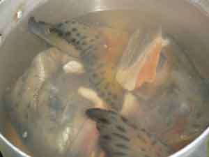 Далее заливаем рыбные отходы холодной водой (!) и доводим до кипения на сильном огне.