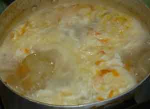 Можно этого не делать, если не любите. Закладываем в уху пассированные овощи, даем закипеть ей. А теперь обещанный интересный момент- куриное яйцо взбалтываем вилкой и в кипящую уху тонкой струйкой вводим его. Одновременно нужно перемешивать, чтобы образовались «кудряшки».