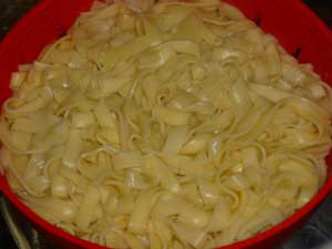Параллельно ставим варить лагманную лапшу. Кстати, домашнюю лапшу можно приготовить самим, нарезав ее для лагмана ленточками. Не забудьте добавить соль при варке.