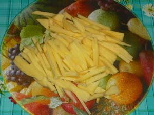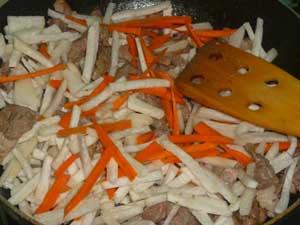 Редьку и морковь режем соломкой и закладываем к мясу. Обжариваем немного и теперь можно посолить.