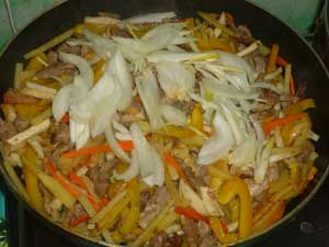 Поочередно закладываем их в сковороду. Обжариваем, помешивая. Лук нарезаем соломкой и тоже кладем к мясу с овощами.