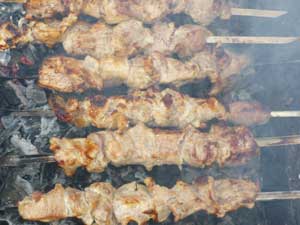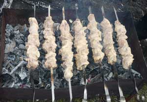 Можно использовать готовые угли, а можно разжечь мангал на березовых дровах. Когда пламя погаснет, можно разровнять угли и, нанизав на шампура кусочки мяса, жарить до готовности.