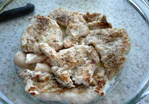 Первым делом нужно сделать заливку для нашей курочки: смешиваем небольшое количество сливок со сметаной, если сливок нет, то можно использовать молочко. Обязательно поперчим, посолим и добавим специи ( в моем случае это прованские травы).