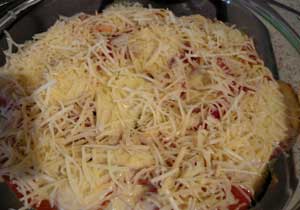 Теперь берем помидоры, нарезаем их как кабачки с картошкой, солим немного, перчим и выливаем на них оставшуюся заливку. Потом возьмем сыр моцарелла и, отламывая маленькие кусочки руками, выкладываем равномерно его на наши овощи с куриным филе.