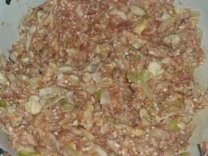 Капусту моем, нарезаем короткой соломкой. Мясо перекручиваем на мясорубке, солим, перчим, добавляем мелконарезанный репчатый лук (половину от нормы, указанной в ингредиентах).