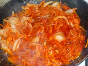 Лук режем полукольцами, обжариваем на сковороде, добавляем муку. Томатную пасту разводим немного водой, добавляем в сковородку. Солим, перчим, провариваем томатно- сметанный соус. Можно в него добавить лавровый лист.