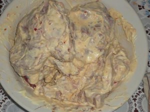Стейки промыть, обсушить полотенцем, посолить немного. Майонез смешиваем с ложкой аджики ( можете использовать и домашнюю жгучую приправу),