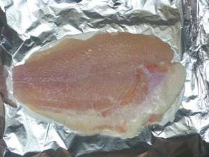 На фольгу кладем ложку сметаны, распределяем по размеру филе.