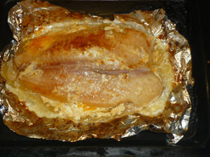 Морской язык запекаем в духовке при температуре 200- 220 градусов 45 минут. По истечении этого времени можно убрать верхнюю фольгу и запечь до румяной корочки еще 10 минут при температуре 230 градусов. Если этого не сделать, то филе будет похоже на отварную рыбу.