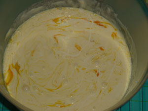 В сметану добавить яйца (оставив немного яйца на смазывания пирога), перемешать.