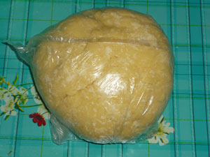 Затем добавляем соль, сахар, гашеную соду и муку. Замешиваем мягкое тесто, которое затем убираем в холодильник на полчаса.