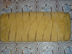 Достаем тесто из холодильника и раскатываем большой квадрат. Переносим тесто на пергаментную бумагу с помощью скалки. Я обошлась без нее. Посередине вдоль выкладываем начинку, с боков, на равном расстоянии делаем разрезы.