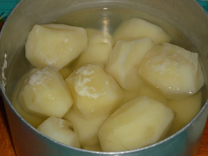 Тем временем готовим начинку для пирожков. Картофель чистим, моем и заливаем кипятком, солим и ставим на огонь. Варим 20 минут после закипания.