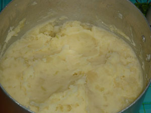 С картофеля сливаем воду, добавляем лук, сливочное масло и толчем до состояния пюре. Остужаем.