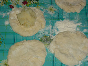 Тесто разделяем на небольшие кусочки и раскатываем скалкой или формуем лепешку руками. На середину кладем начинку из картофеля