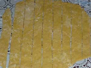 Далее раскатываем наше тесто в пласт толщиной 2-3 мм, режем полосками по 3-4 сантиметра шириной.