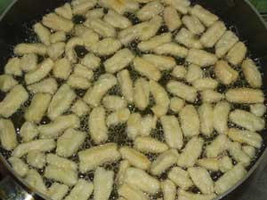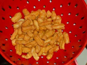 Жарим его небольшими партиями в раскаленном фритюре. Жарим до светло- коричневого цвета.