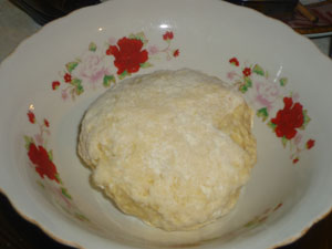 Всыпаем муку и замешиваем тесто. Муки кладем столько, сколько возьмет тесто. Тесто должно получиться крутым.