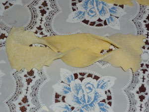Затем раскатываем тесто тонким пластом. Нарезаем прямоугольниками размером примерно 3*8 см. Вдоль делаем надрезик,