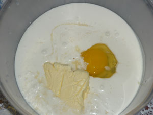 Сметану перемешиваем с сахаром, солью, добавляем яйцо, мягкое масло,