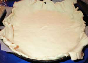 Застелем пергаментной бумагой нашу форму для выпекания (в моем случае это обычная сковородка) и выложим туда раскатанное тесто.