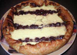 Сверху выкладываем начинку из творога, выкладываем ее рядами, чтобы оставалось место для клубничной начинки.