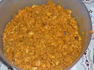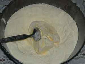 Все перемешиваем до образования однородной массы. На первый взгляд, тесто может показаться очень сухим и трудным при приготовлении. Продолжайте вымешивать и постепенно Вы увидите, что муки можно даже и добавить. Можно еще пол- стакана. Тесто это не должно липнуть к рукам, а также к посуде. Если тесто продолжает липнуть- добавьте еще муки. Оно должно быть достаточно плотным по консистенции, иначе пропускать его через мясорубку (да-да, это делать придется) будет весьма затруднительно, если не сказать хуже.