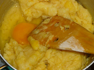 Снимаем с огня и остужаем до теплого состояния. Затем, по одному, вбиваем яйца и очень хорошо размешиваем. Затем добавляем следующее яйцо.