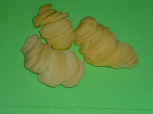 Картофель вымыть, отварить минут 15 в воде. Добавить соль после закипания. Слить воду, остудить, очистить. Нарезаем картофель тонкими кружочками.