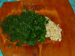 Зелень вымыть, обсушить, мелко порезать. Чеснок пропускаем через пресс или режем мелко ножом.