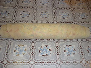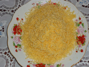 Колбасу вареную трем на крупной терке. Резать кубиком не рекомендую, поскольку колбаса будет вываливаться из нарезанного рулета, к тому же сам рулет будет свернут недостаточно плотно. Лучше не полениться и натереть на терке.