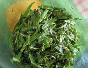 К нарезанным веточкам необходимо добавить сахарный песок и деревянной толкушкой необходимо извлечь сок, чтобы все веточки были, как выжатый лимон.