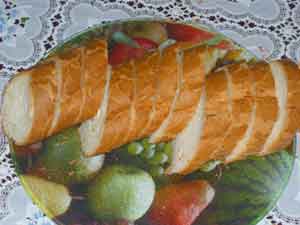 Багет нарезать ломтиками.Из половины багета получится где-то 10 ломтиков. Этого количества нам вполне хватит.