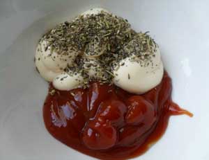 Для пиццы необходимо приготовить соус. Для этого соединяем кетчуп, майонез и добавляем немного прованских трав.