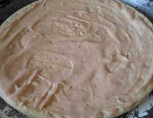 Форму для пиццы и обязательно присыпаем небольшим количеством муки и смазываем соусом, который сделан с майонеза и кетчупа.