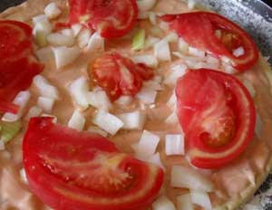 Мелко нарезаем лук, а вот помидоры необходимо нарезать дольками. И все аккуратно раскладываем на основу для пиццы.