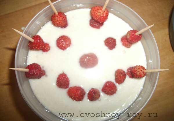 Теперь беремся за ягоды: берем шпажки и на каждую шпажку начинаем нанизывать земляничку, делаем это так же, как канапе. Но небольшую часть ягоды нужно оставить для украшения нашего смузи.