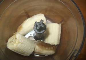 Приступаем к готовке: очищаем банан, нарезаем его на средние кусочки и кладем его в тару от блендера.