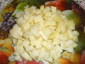 Готовим овощи (картофель, морковь, свеклу) отварить, очистить и нарезать одинаковыми мелкими кубиками.