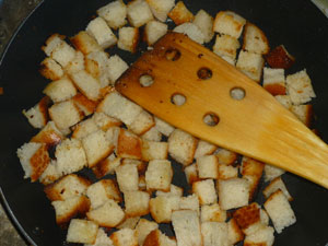 Нарезной батон нарезаем кубиком. Корочки с батона срезать вовсе не обязательно. Обжариваем кубики батона в масле с чесноком. Батон должен приобрести золотистый цвет.